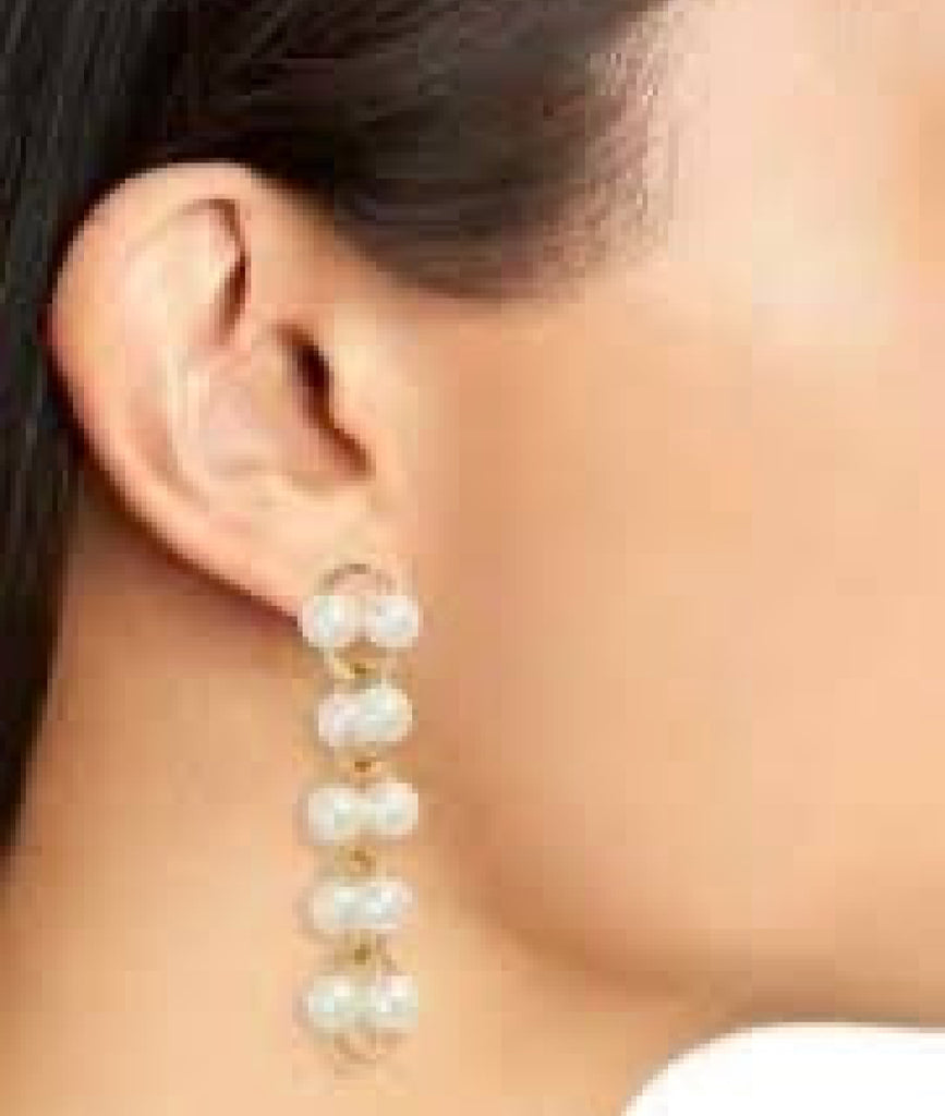 The classic pearl earrings is reimagined here with imitation pearls threaded on golden oval links. Yellow gold plated drop earrings with pearl cluster accents.
