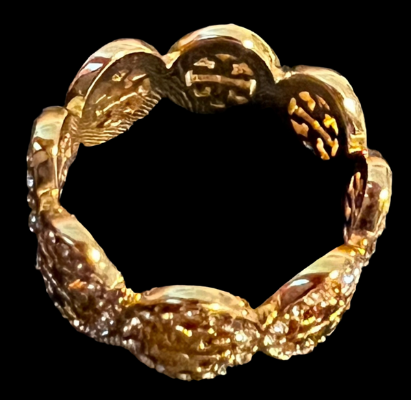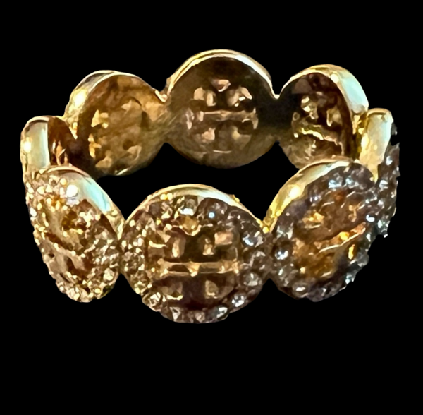 Tory Burch Gold And Crystal Embellished Monogram Ring With Swarovski Pave Size 6