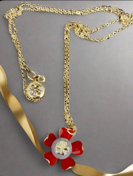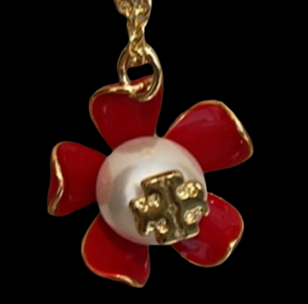 NWOT Authentic Tory Burch Gold And Samba Red Pearl Flower Necklace