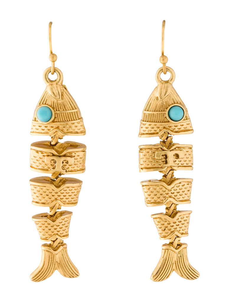 Gold tone Tory Burch Delicate Fish Drop Earrings featuring blue resin, textured and satin finishes throughout and French hooks. • Metal Type: 16K gold plated brass hardware