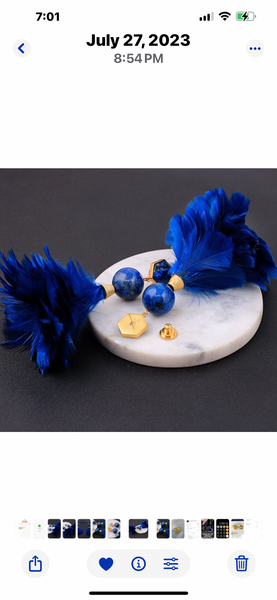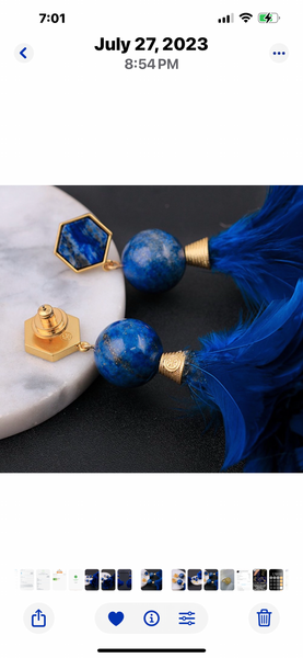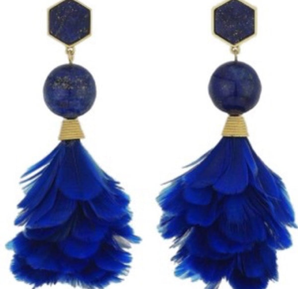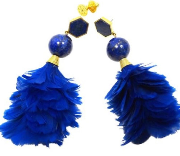An eclectic mix of bohemian glamour and American sportswear, the Tory Burch brand is known for effortlessly stylish, always-interesting pieces ranging from apparel to shoes to accessories. Tory finds her inspiration in the easy lifestyle of her parents, consummate entertainers and avid travelers in the '60s and '70s, and infuses it with the vibrancy of New York City, her home. Tory Burch design gold plated, lapis lazulie, and blue feathers statement earrings.