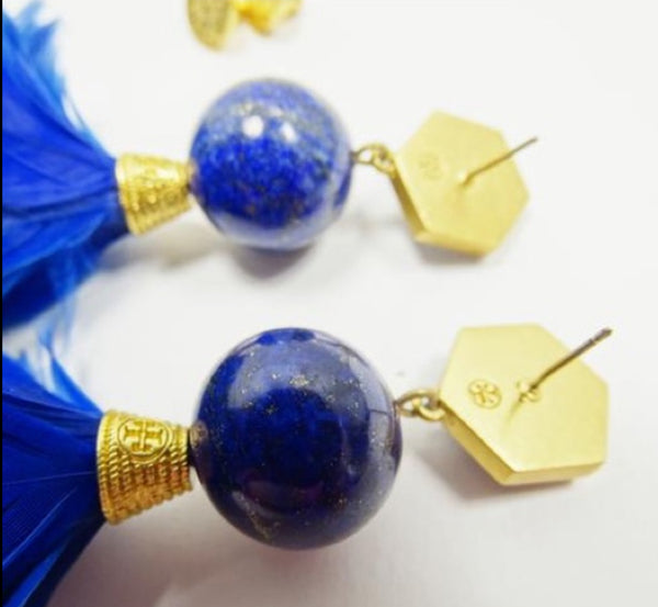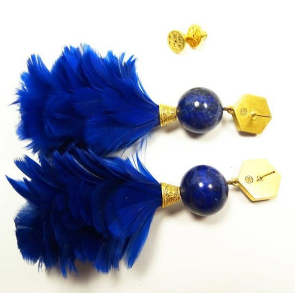 NWOT Authentic Tory Burch Gold Plated Lapis Lazul And Feather Statement Drop Earrings