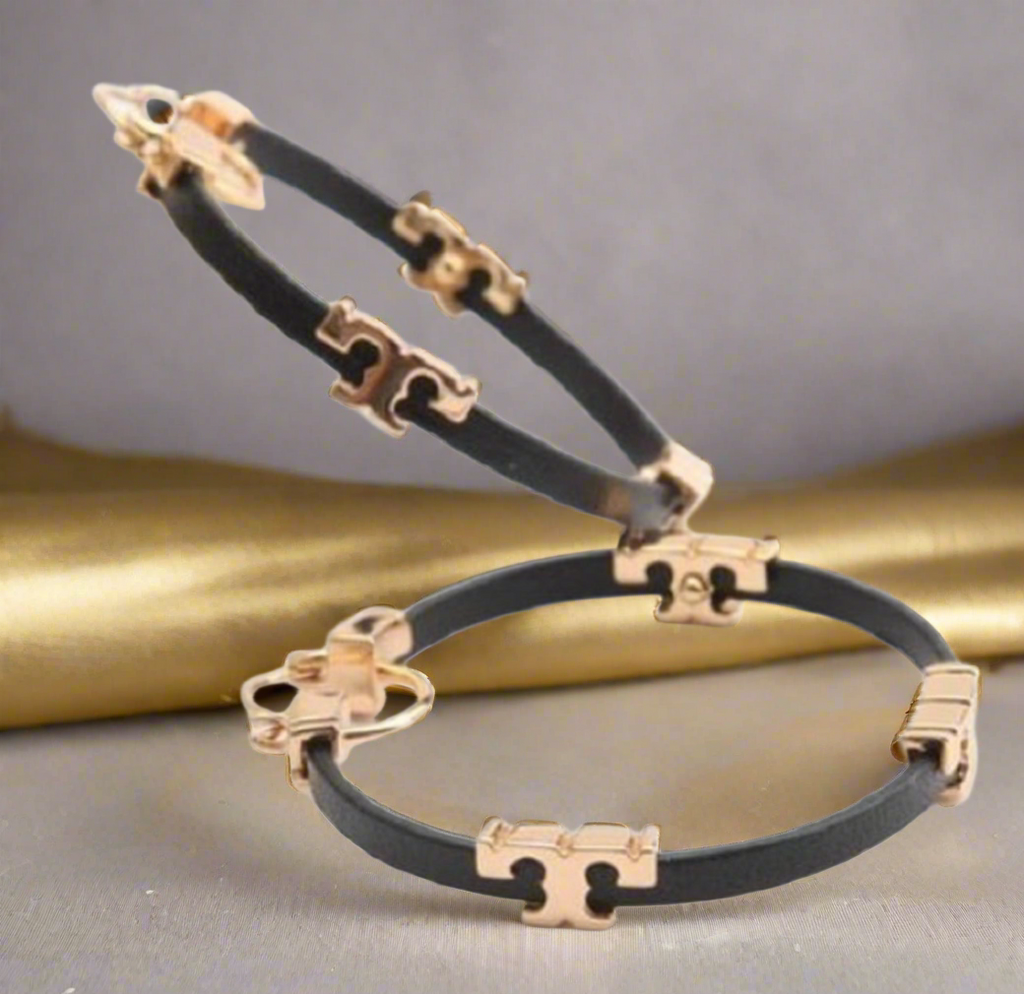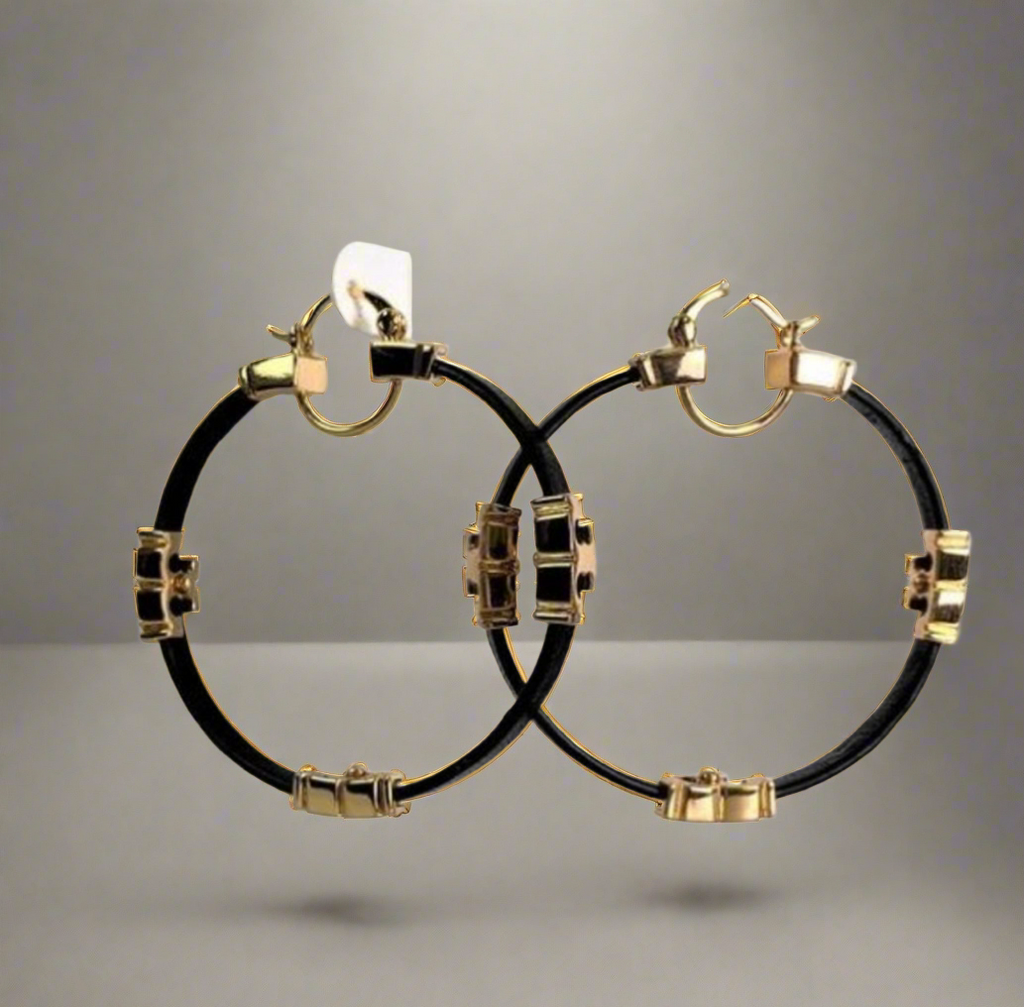 Tory Burch Gold Black Serif T & Leather Hoop Earrings
