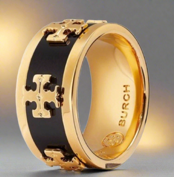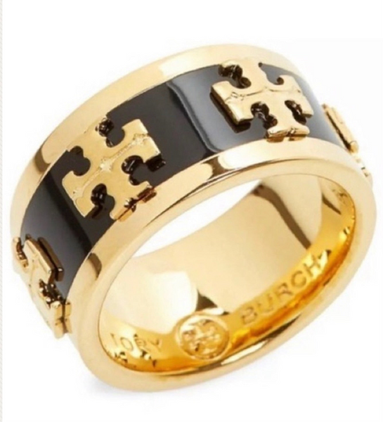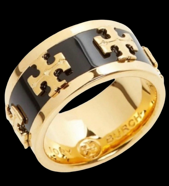 NWOT Authentic Tory Burch Wide Band Black Enamel With Raised LogoRing Size 7