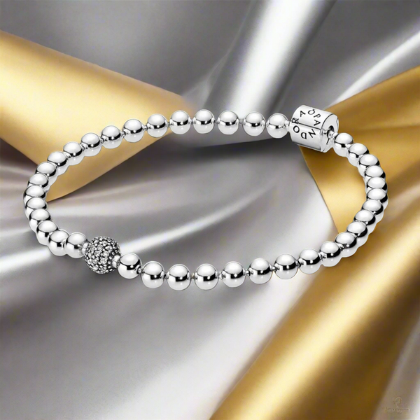 When you want to wear chunky and edgy beads with an elegant twist, this sterling silver Beads & Pavé bracelet is the perfect choice. The bracelet takes its inspiration from the alternative looks of body piercings and punk-inspired styles and adds a polished, refined twist. It features a fully beaded chain with one large pavé-set bead and a barrel clasp.