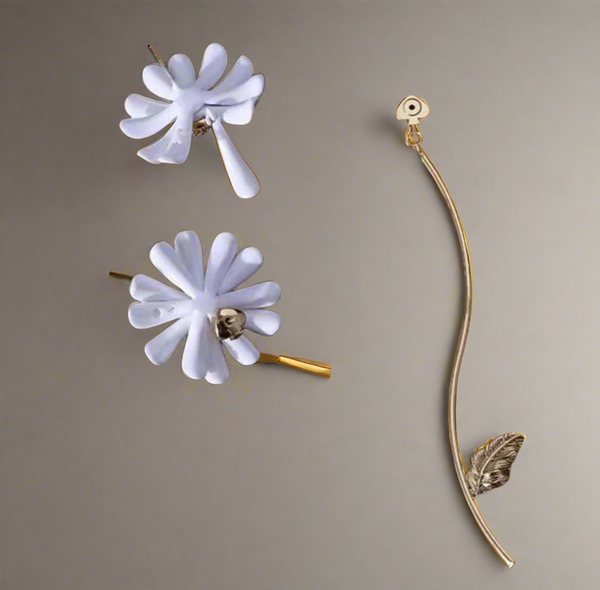April showers bring may flowers. Our into the bloom statement earrings are designed with sweet daises atop shiny gold-plated metal. did you notice the intentional mismatched details? we made one with a dangling plucked petal and the other with a long gold-tone stem for an unexpected finishing touch.