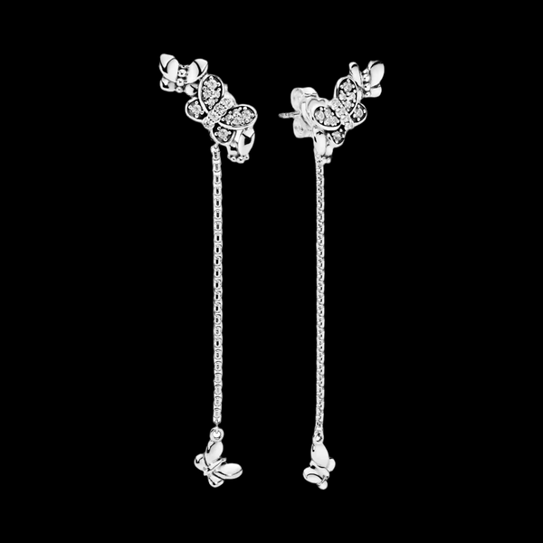 Pandora Ladies Bedazzling Butterflies Earrings In Sterling Silver. Adorned with sparkling stones, this sterling silver design features butterfly-embellished chains and jackets, which can be removed to create an entirely new look.